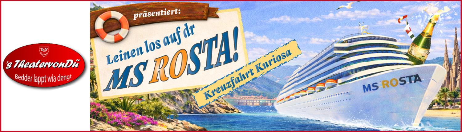 Auf große Fahrt mit dem exklusiven Kreuzfahrtschiff MS Rosta begibt sich das TheatervonDü in die Spielsaison 2026. In ihren Kabinen auf dem Sonnendeck fahren sie von Savona in Italien Richtung Marseille. Von dort aus geht es weiter nach Barcelona, Palma de Mallorca, Palermo, die ewige Stadt Rom und wieder zurück nach Savona.
