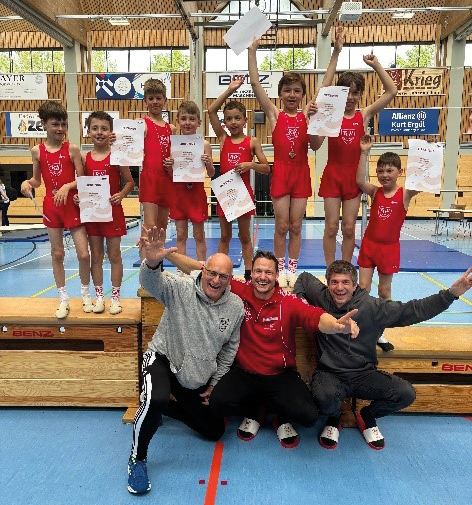 Die D-Jugendmannschaft mit Jonathan Amos, Benjamin Braun, Tim Janke, Louis Prochaska und Marlon Storz turnten in allen Teilen einen gelungenen Wettkampf und belegte knapp vor der SG Gundelsheim aber deutlich hinter dem TSV Ellhofen den zweiten Platz und wurden somit Vize-Mannschaftsmeister in ihrer Altersklasse. Mit vollem Stolz reckten sie den Pokal bei der Siegerehrung in das Mannschaftsfoto.